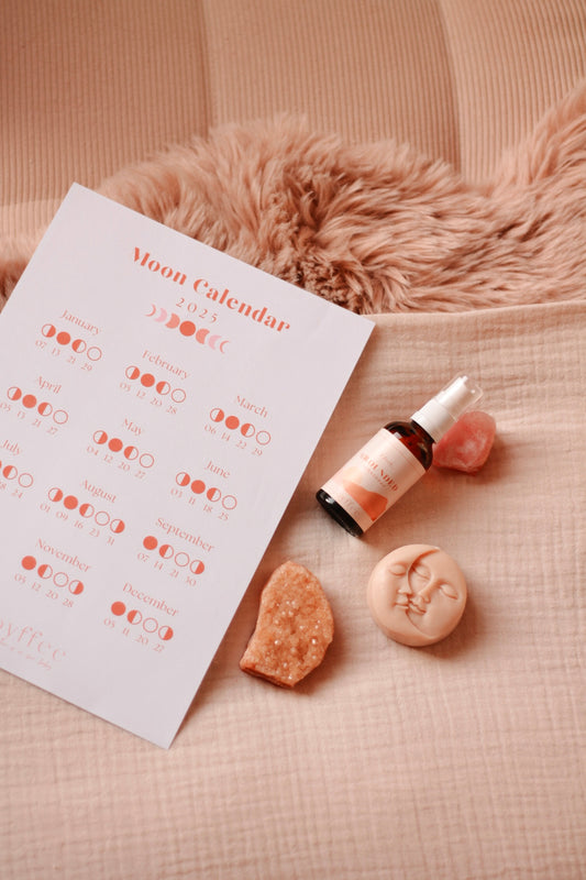 • Een sfeervolle afbeelding met een maan kalender en spirituele items zoals edelstenen, een geurkaars en een aura spray, in zachte aardetinten.